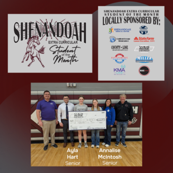 Congrats to Ayla Hart (Student Council) and Annalise McIntosh (Speech) on being nominated and selected as the Shenandoah Extra-Curricular Students of the Month.